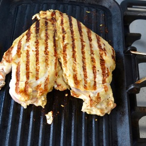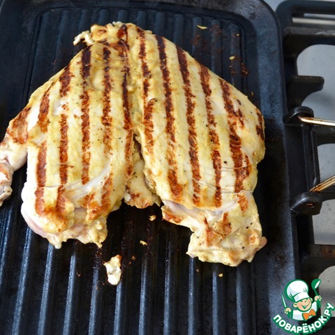 Тем временем, разогреть сковороду-гриль, выложить курицу и обжарить с обеих сторон до готовности.