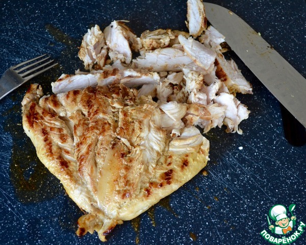 Обжаренную курицу нарезать тонкими полосками и выложить на салат.