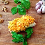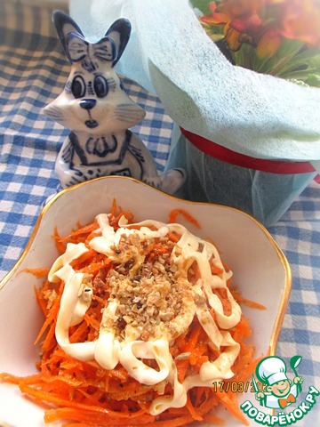 Добавить к моркови орехи, чеснок, майонез. Перемешать. Украсить тематически.