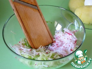 Очищенный вареный картофель, огурцы, редис, яйца натереть на терке для моркови по-корейски. Овощи получаются в виде длинной тонкой соломки. Обязательно одеть тканевые перчатки, так как терка очень острая!