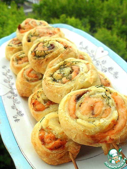 На природу для легкого перекуса очень удобно взять запеченные рулеты из слоеного теста с маринованной рыбой и зеленью.