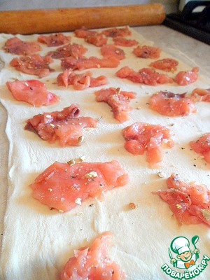 Слоеное тесто разморозить, раскатать, выложить на него замаринованную горбушу. Рыба получилась очень ароматной благодаря нашей приправе, не удержалась и съела несколько кусочков с хлебом!