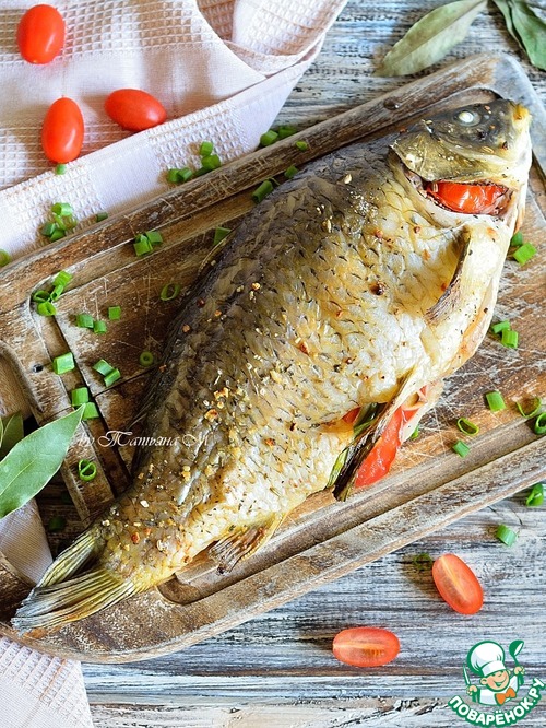 Помидор, чеснок порезать дольками, нафаршировать карпа овощами, луком, вложить лавр, в жаберное отверстие так же вложить начинку;