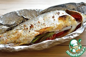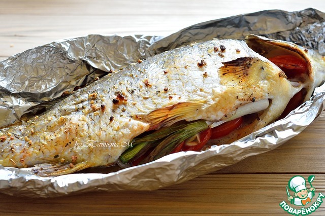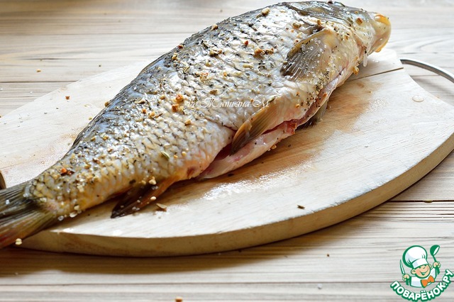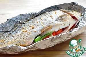 Выложить карпа на фольгу, из которой сформировать "лодочку-блюдо", сбрызнуть рыбу маслом;
