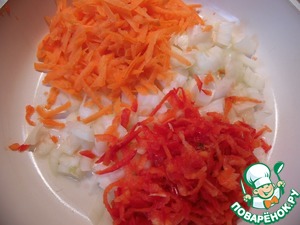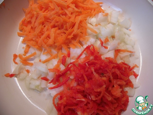 Морковь и перец натереть на крупной терке, лук мелко нашинковать. Подготовленные овощи обжарить на растительном масле 2-3 минуты.