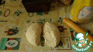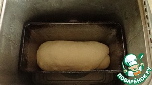 Через 2 часа добавляем в опару белок 1 яйца, ч. лож. соли, ст. лож раст. масла и 300 г муки, для вкуса 1 ч. лож порошка горчицы. Снова ставим программу замеса-Пельмени. Через 20 мин. вынимаем готовое тесто на стол, делим на 2 части, одну часть убираем в холодильник. вторую раскатываем в лепешку и сворачиваем рулетом и укладываем в смазанную маслом форму Л7.