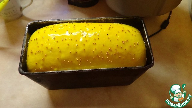 Ставим форму Л7 в ХП на расстойку 2-2.5 часа. Хлеб поднимается до краев формы. Смазываем верх оставшимся желтком и посыпаем у меня семенами горчицы, можно кунжутом.