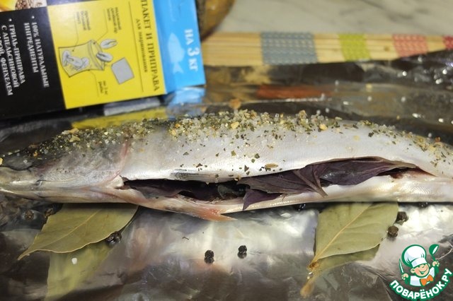 Скумбрию внутри и снаружи посыпаем специями Форестер для рыбы. Внутрь кладем листья базилика. -