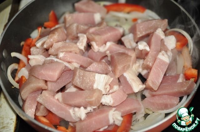 К овощам кладём свинину, обжариваем всё, помешивая, около 5 минут.