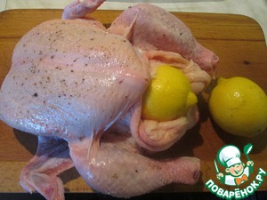 Этот рецепт совсем несложный и при этом совершенно бесподобный! Цыпленок готовится без добавления масла, но получается очень сочным и красивым. В том месте, где лимон соприкасался с тушкой во время приготовления чувствуется приятная горчинка, придающая пикантность блюду.