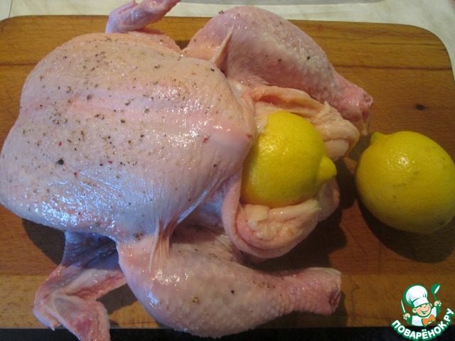 Лимоны вымыть, обсушить, покатать по столу и наколоть каждый плод шпажкой или вилкой. Должно быть не менее двадцати отверстий. Оба лимона вложить в брюшную полость цыпленка.