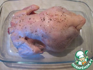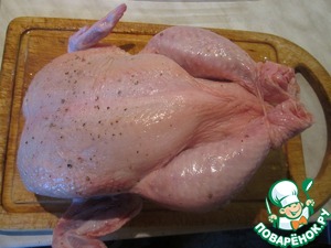Духовку разогреть до 200 градусов. Тушку цыпленка вымыть, обсушить бумажным полотенцем, посолить и поперчить по вкусу.