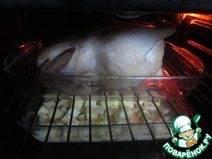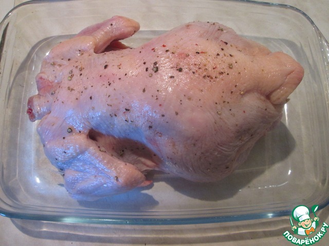 По истечении нужного времени тушку аккуратно перевернуть, стараясь не порвать кожу, и запекать еще 30-35 минут.