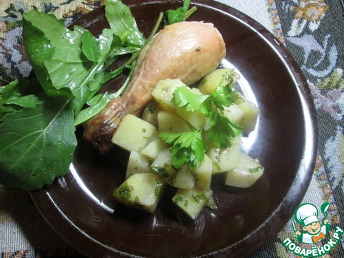 Когда картофель будет практически готов, примерно минут через 40, посыпать его мелко порезанной петрушкой, перемешать и вернуть в духовку на 5 минут. За это время должен приготовиться и цыпленок. Накрываем на стол и подаем блюдо.