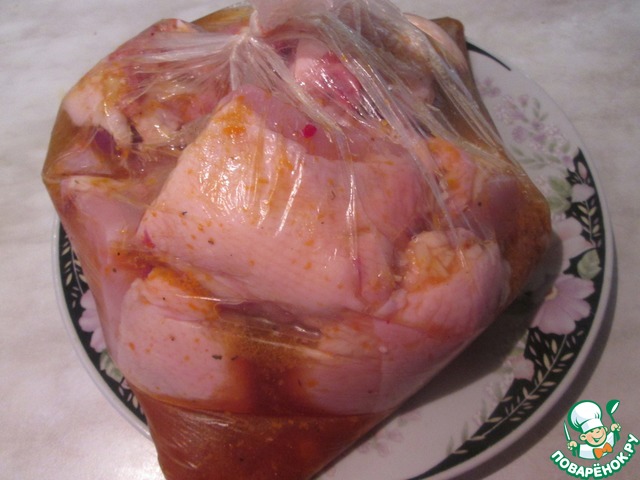Курицу порезать порционными кусками, положить в полиэтиленовый пакет и залить маринадом. Пакет завязать и положить в холодильник на 3 - 4 часа. Мне нужно было поспеть к ужину, поэтому я мариновала курицу два часа при комнатной температуре.