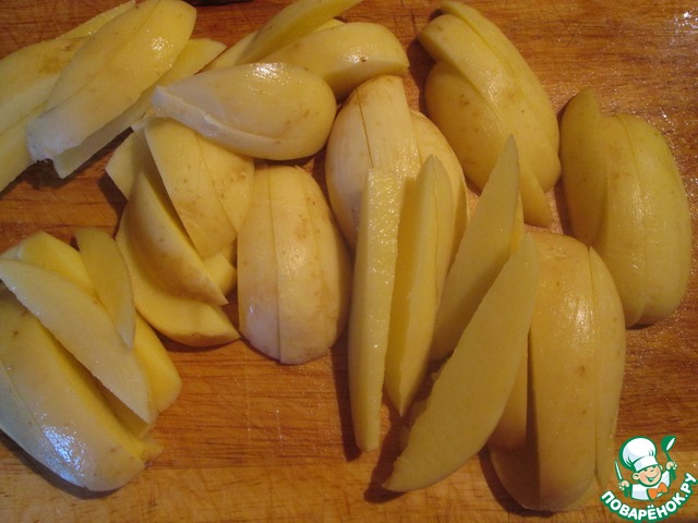 Когда время маринования курицы будет заканчиваться, картофель, помыть, почистить, крупно порезать, отварить в кипящей воде 5 - 7 минут.