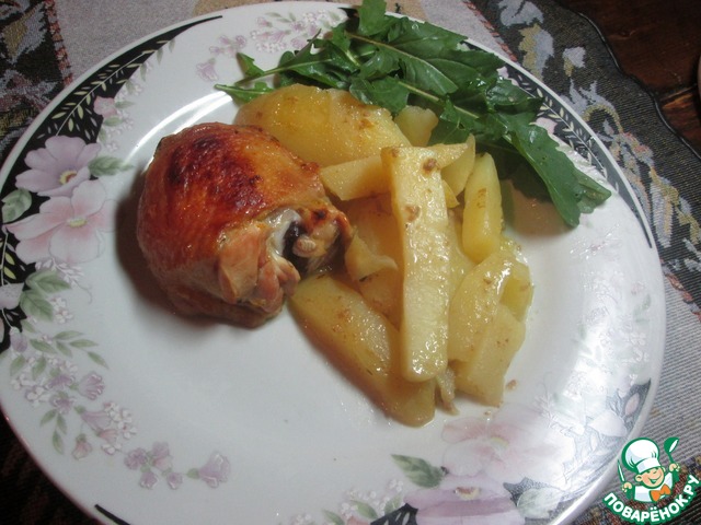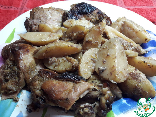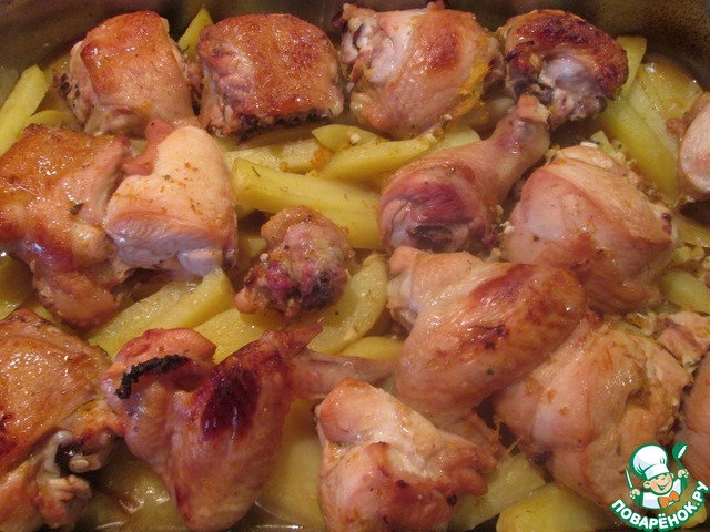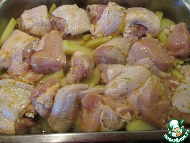 Выложить картофель в глубокий противень, сверху уложить куски курицы и полить все маринадом.