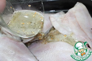 Залить маринадом камбалу. Затянуть пленкой тару, в которой лежит рыба, и отправить на часок в холодильник.