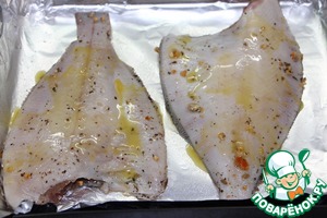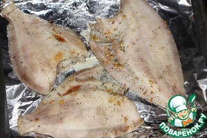 Выложить камбалу на противень, застеленный фольгой. И поставить под гриль духовки, на 15 минут, 3 уровень мощности.