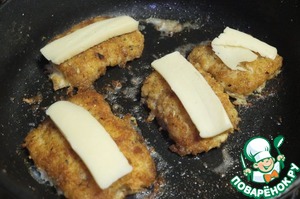Когда я перевернула рыбку мне захотелось добавить немного сыра. На каждое филе я положила по ломтику сыра.