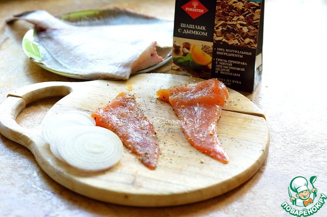 - Специи (ТМ Forester к рыбе с щепой (соль морская, цедра апельсина, сахар, фенхель, чеснок, мята, перец белый)) — 1,5 ст. л.