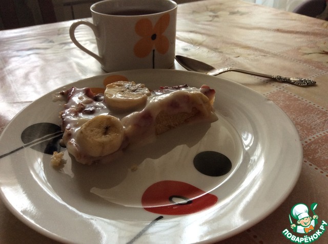Когда пирог остыл, заливаем его получившейся смесью. Верх можно также украсить ягодами, я украсила бананом.