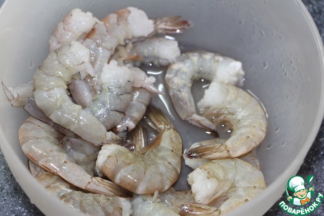 Креветки разморозить, удалить темную кишечную вену