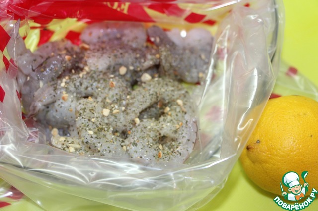 Выложить креветки в пакет, приложенный к набору для маринования рыбы гриль FORESTER, всыпать 1 ч. л. приправы