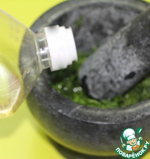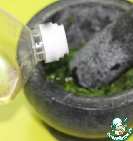 В ступке растереть в пасту измельченный чеснок с солью и мелкорубленной зеленью (укроп или петрушка, или и то и другое),