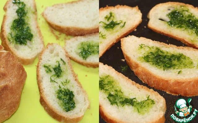 Каждый ломтик смазать зеленым маслом и обжарить на сковороде-гриль с двух сторон.