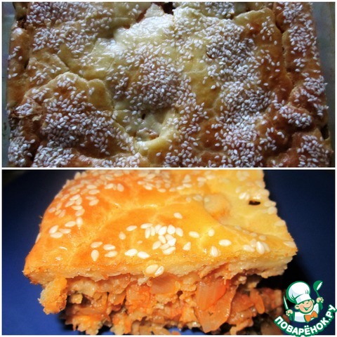 Сверху выливаем остальное тесто, разравниваем его по начинке, по желанию посыпаем кунжутом.
