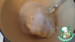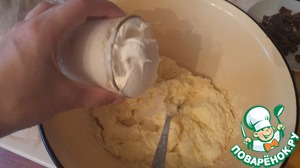 Добавить муку и замесить тесто, тесто должно получиться чуть гуще, чем на оладьи.