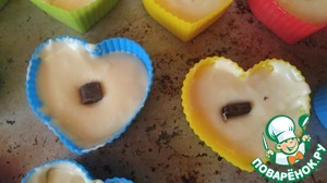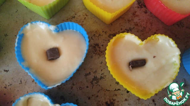 Набрать тесто в формы (больше половины) и вставить кусочек шоколадки.