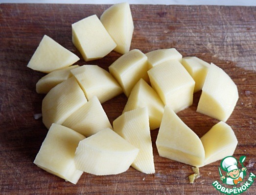 Когда лук стал мягким, добавляем к нему картофель и кукурузу, а так же 500 мл кипящей воды (или овощного бульона). Накрываем крышкой и варим минут 15- 20 (до готовности картофеля).