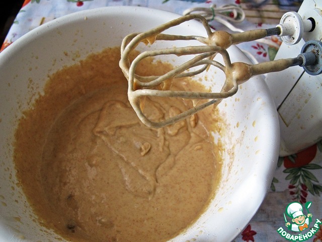 Смешать два вида муки с разрыхлителем. Продолжая взбивать, всыпаем муку, добавляем изюм. Тесто должно быть по консистенции, как густая сметана.