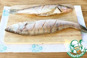 Судаков почистить, выпотрошить, хорошенько промыть под проточной водой и тщательно обсушить бумажным полотенцем. Сделать по 3 глубоких надреза с каждой стороны.