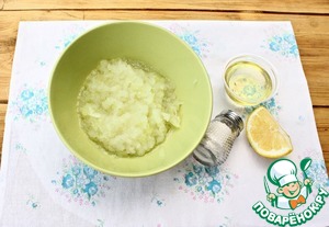 Приготовим маринад. Лук пропустим через мясорубку, выльем выделившийся сок. Добавим соль, растительное масло и лимонный сок, перемешаем.