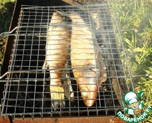 Запекаем рыбку до готовности, время от времени переворачивая решетку, около 20 минут.