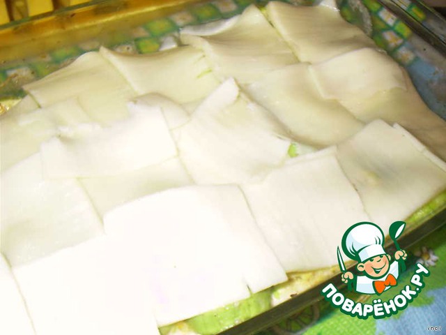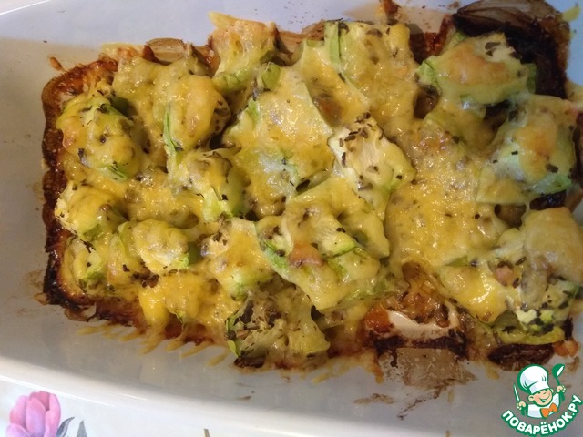 Достать из духовки и на кабачки сверху выложить нарезаный или натёртый на тёрке сыр. Затем опять поставить в духовку до тех пор, пока сыр не превратится в аппетитную, золотую корочку, а это ещё 10-15 минут.