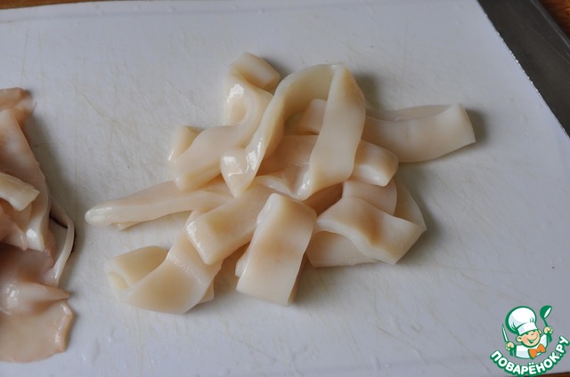 • Берём кальмары, чистим, нам понадобятся тушки без "ушек". Обрезки варю обычно и делаю салат.