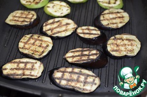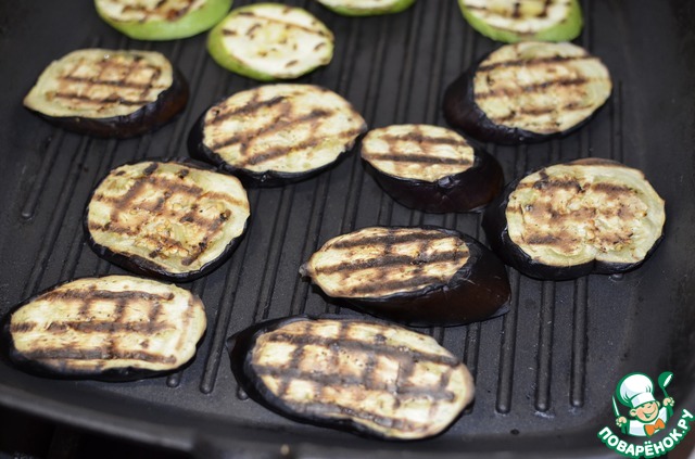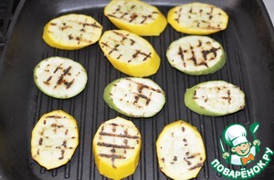 Т. е. прожарить с одной стороны, потом с другой и процедуру повторить с изменением направления полосок, что получились сеточка или квадратики ))) Плюс такая прожарка приготовит кабачки до полной готовности. -