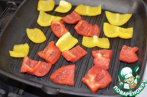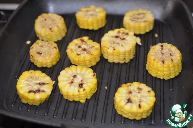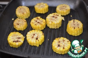 Порезать вареную кукурузу в початках, и так же обжарить на сковороде гриль.
