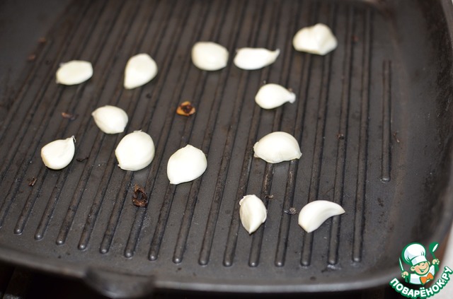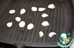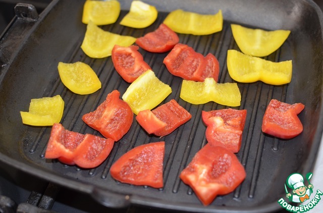 Нагреть сковороду гриль, и обжарить кабачки на сухой сковороде без добавления масел, сделав на кабачках сеточку.