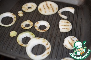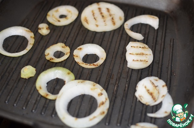 Репчатый лук порезанный кольцами, так же обжарить на сковороде гриль.