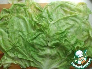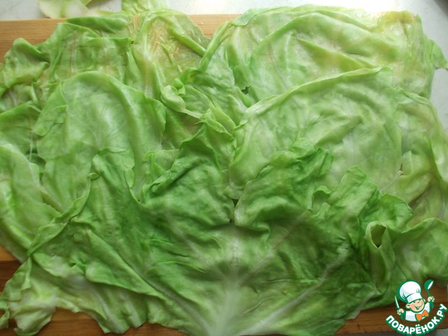 Крупные листья молодой капусты снять и залить кипятком на пару минут, чтобы стали мягкими
