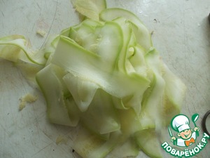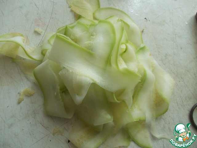 Кабачок порезать тоненько овощечисткой.