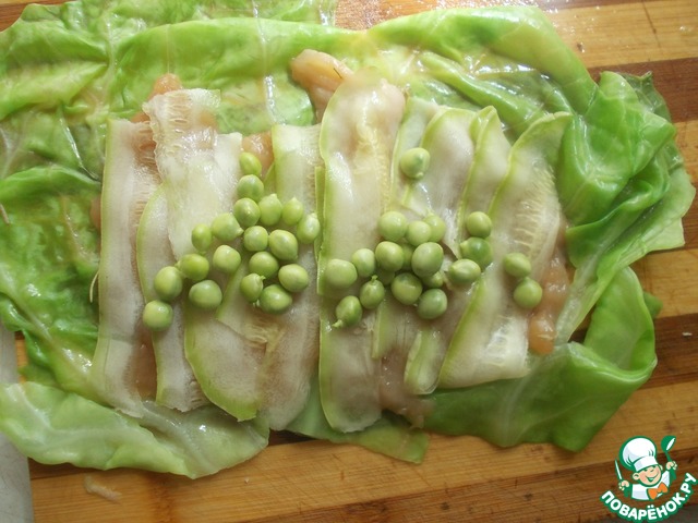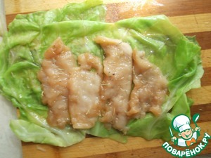 Берем лист капусты, выкладываем на него рядком кусочки курицы.