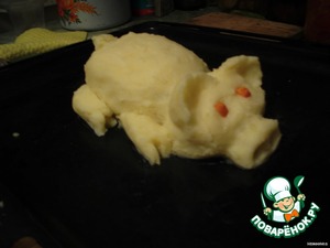 Выложить этот "батон" на противень и сформировать поросенка, глазки сделать из изюминок либо кусочков морковки, смазать маслом. Запекать в духовке до румяной корочки.