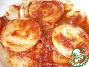 Маринадом залить нарезанный лук и оставить мариноваться на 15 минут. -