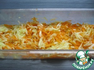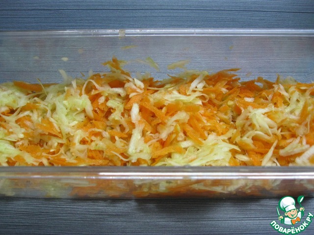 Морковь и кабачок (т. к. у меня был средних размеров, я взяла половину) потереть на крупной терке, чуть присолить, оставить на 5-10 мин. выделившийся сок слить